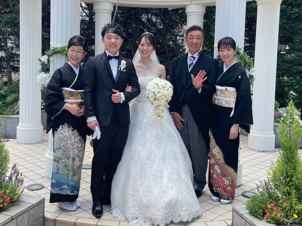 結婚式はホテルオークラ福岡の教会で行いました。同級生など多くの方々から祝福を受け、とても幸せそうな二人でした。この感激を忘れずに、明るい幸せな家庭を築いてもらいたいと思います。